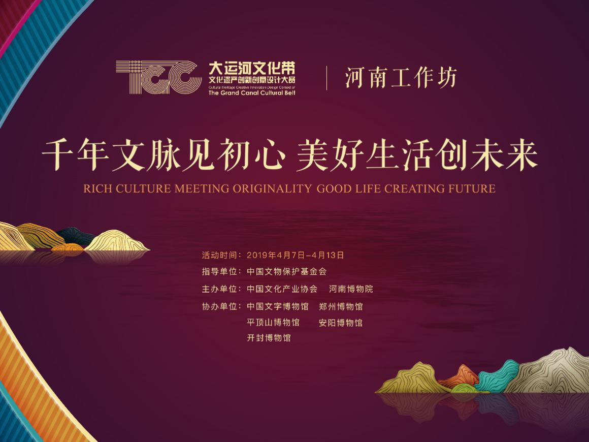 “大运河文创设计大赛”——河南设计工作坊于2019年4月7日-13日在河南博物院举行,为期7天。本次工作坊由河南博物院、中国文化产业协会主办,中国文字博物馆、郑州博物馆、开封博物馆、安阳博物馆、平顶山博物馆等协办。